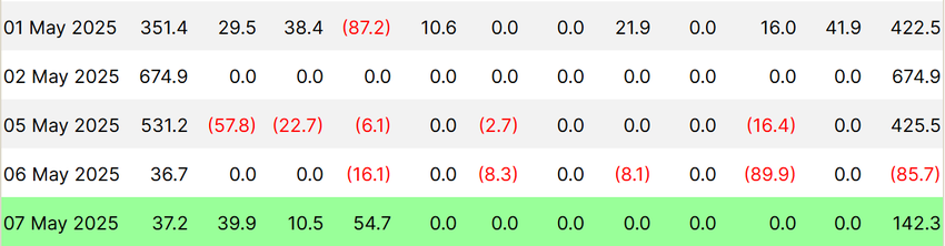 Güçlü piyasa duyarlılığının yanı sıra, Bitcoin’in genel makro momentumu olumlu spot ETF akışlarıyla destekleniyor. Bu girişler, 6 Mayıs hariç, son hafta boyunca büyük ölçüde olumlu kaldı. Bu tarihte 85 milyon Dolar çıkış kaydedildi.