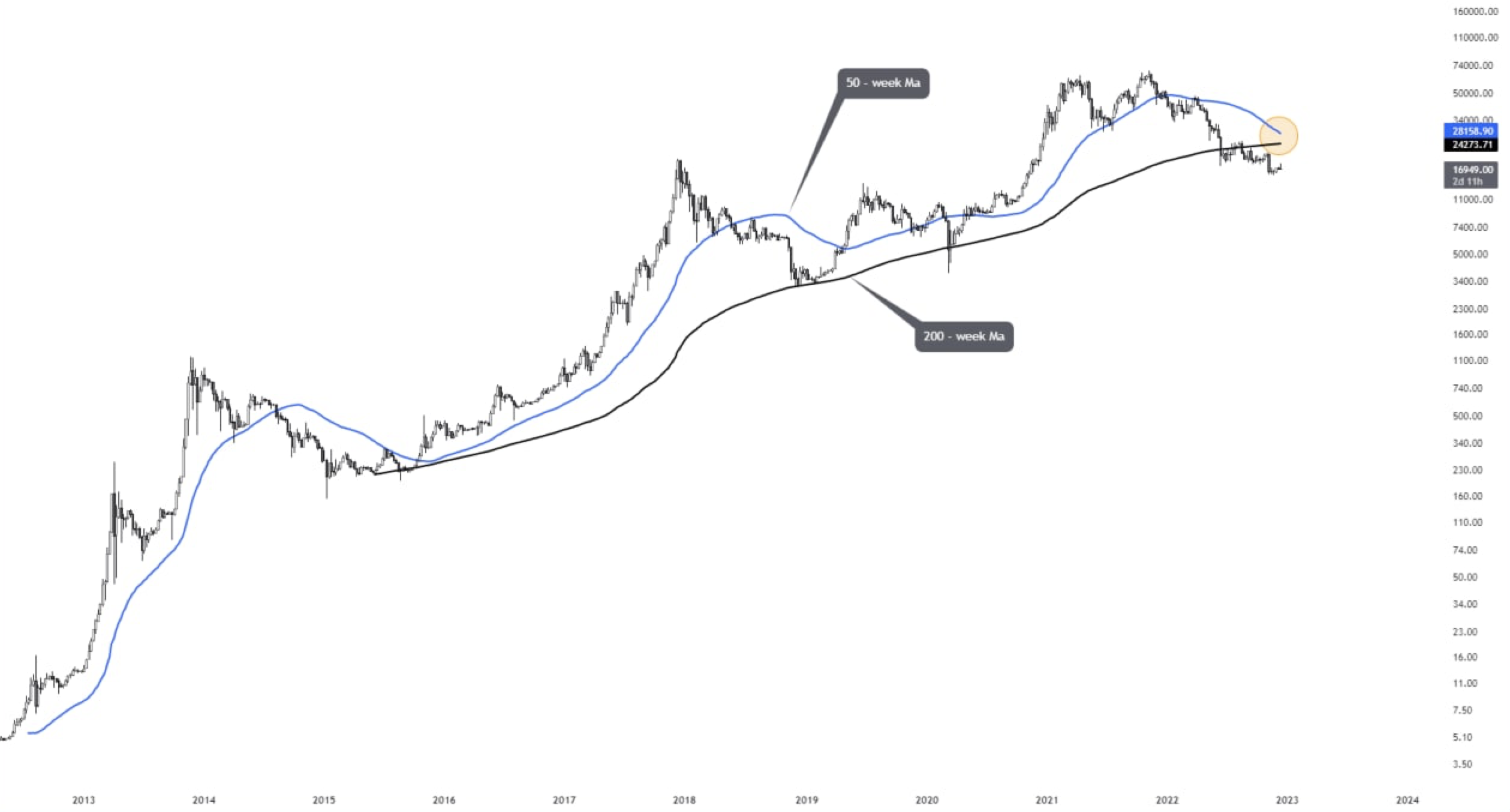 Bu ortamda BTC için yeni bir çıkış izi arayan yatırımcıları tehlikeli bir süreç bekliyor olabilir. Zira BTC grafiklere bakıldığında kısa süre içinde bir Death Cross ihtimali gündemde. Grafiklere göre 50 haftalık basit hareketli ortalaması (SMA) kuvvetli bir şekilde düşüş eğiliminde. Bu çizgi ilk kez 200 haftalık basit hareketli ortalamanın (SMA) altına düşebilir.