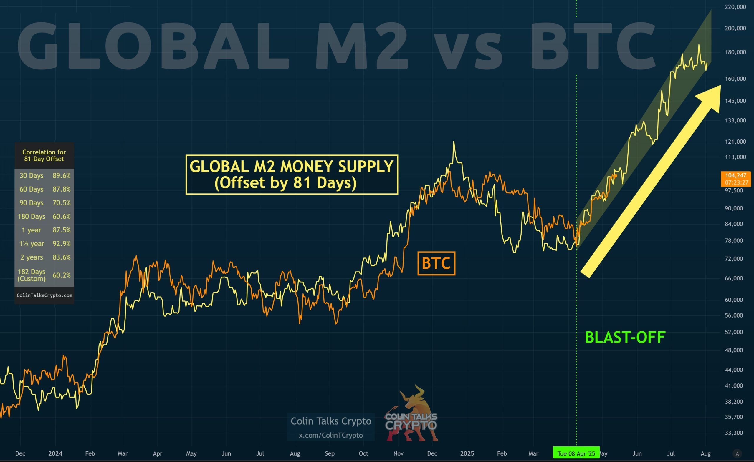 Kripto para uzmanı Colin Talks Crypto’ya göre, M2 büyümesi— Fed, ECB ve BoJ gibi merkez bankalarından gelen para arzının bir ölçüsü— Bitcoin’in 8 Nisan’dan bu yana 76.000 Dolar’dan 105.000 Dolar’a yükselişini doğru bir şekilde tahmin etti. Bu trende dayanarak, Colin Bitcoin’in Mayıs ayında 120.000 Dolar’a ulaşabileceğini öngörüyor.