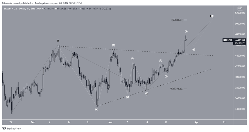 En muhtemel dalga sayımı analizine göre Bitcoin, A-B-C şeklindeki bir düzeltmenin (siyah) C dalgası içinde hareket ediyor. Buna ek olarak C dalgası, 14 Mart’ta başladı ve 23 Mart’ta onaylandı. Onaylanma öncesinde ise BTC fiyatı, simetrik üçgen formasyonundan çıkış gerçekleştirdi.