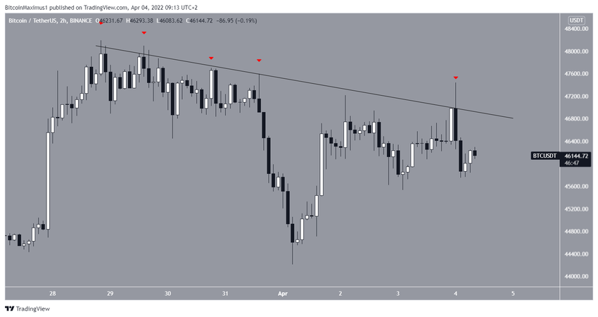 İki saatlik grafiğe bakıldığında, 28 Mart’tan bu yana alçalan bir direnç çizgisinin takip edildiği görülüyor. Ayrıca Bitcoin, bu süreçte birçok kez direnç çizgisinden reddedildi (kırmızı oklar). Ancak direnç çizgisi aşılırsa yükseliş hareketinin hız kazanabilir.