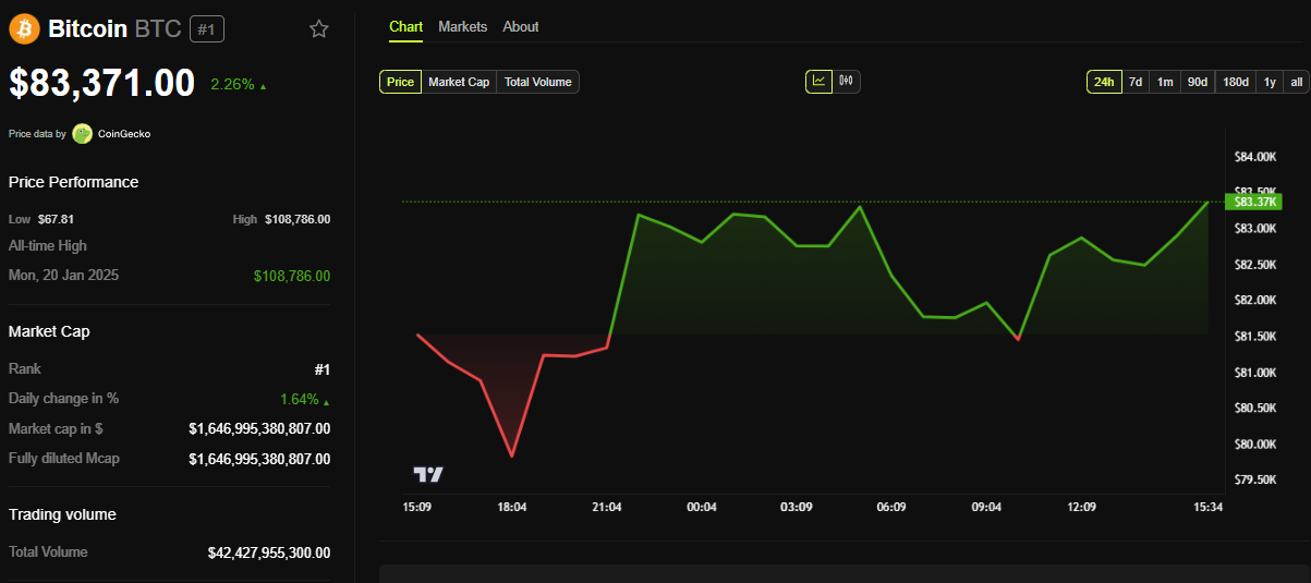Bitcoin (BTC) mütevazı bir yukarı hareketle yanıt verdi ve 83.371 Dolar’a sıçradı. Bu artış, düşük enflasyonun daha fazla sıkılaştırma olasılığını azaltması ve risk alma eğilimini desteklemesiyle geldi. Borsa da olumlu tepki verdi ve büyük endeksler, verilerin açıklanmasının ardından kazançlar kaydetti.
