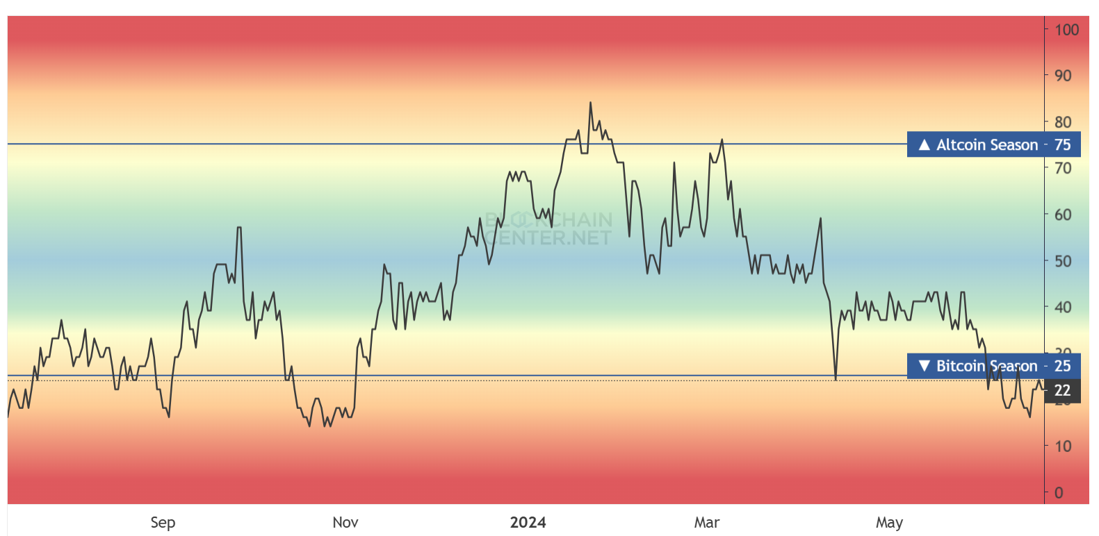 Altcoin Sezonu endeksi, piyasa genelindeki kayıplar nedeniyle şu anda Bitcoin sezonunun aktif olduğunu gösteriyor. Endeks 0 ile 100 arasında değişiyor ve 25’in altındaki değerler Bitcoin Sezonunu işaret ediyor. Şu anda bu değer 24.