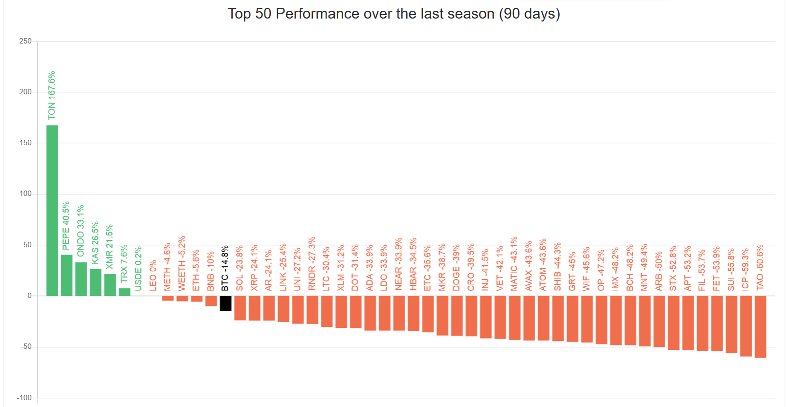 Stablecoin kategorisi haricindeki en iyi 50 altcoin’in performansına bakıldığında, sadece yedi token kazanç sağladı. Toplamda, yaklaşık 13 token BTC’yi aşmayı başardı, bunların beşi ise kayıp kaydetti.