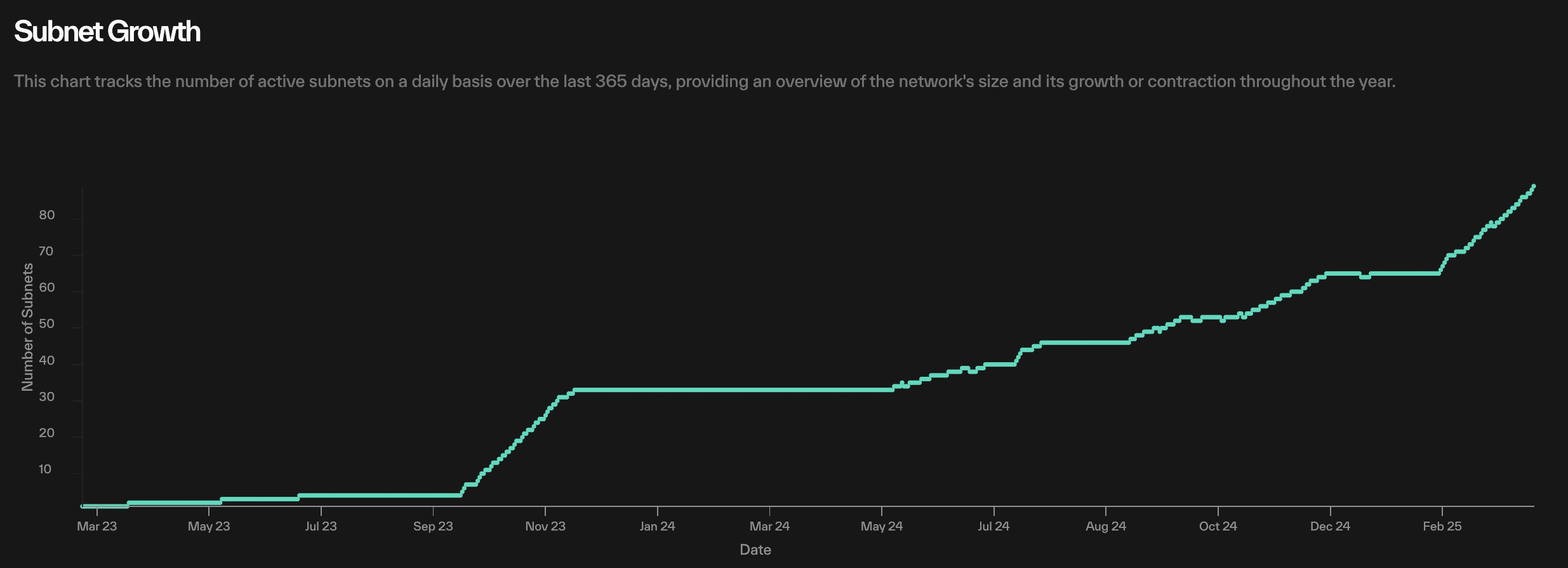 Token fiyatı o zamandan beri bir düşüş dönemi geçirmiş olsa da, uzun vadeli potansiyelin birkaç önemli sinyali var. Esasen, Bittensor için anahtar faktör subnet’lerdeki büyümedir.