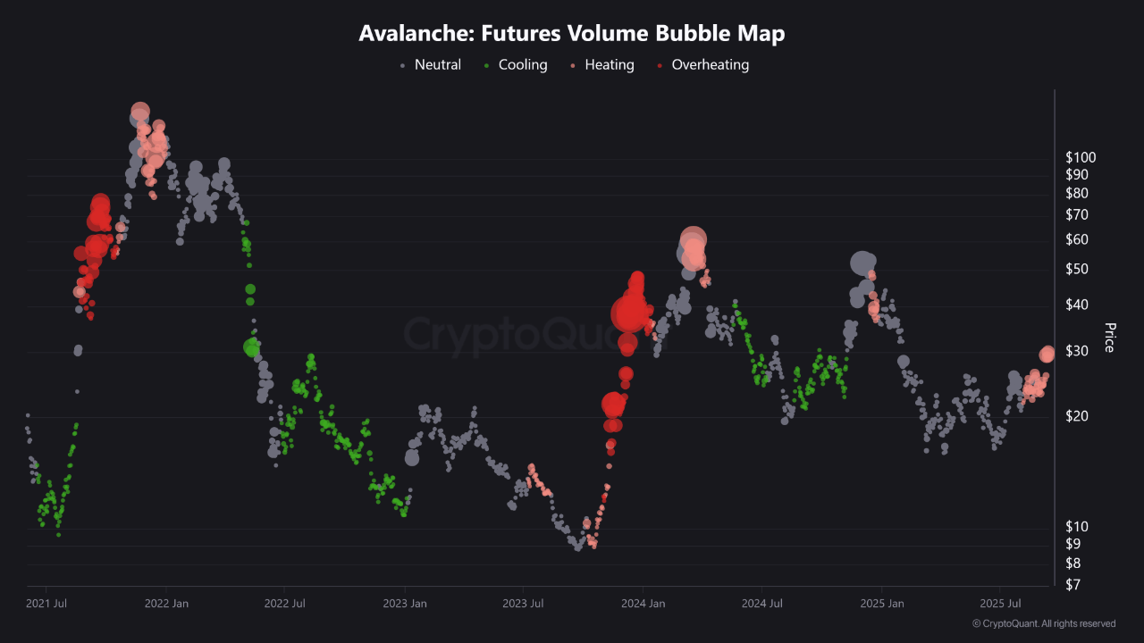 Büyümeye rağmen, bir düzeltme riski devam ediyor. Bir analist, AVAX’ın Vadeli İşlemler Hacim Balon Haritası’nın ‘ısınma’ işaretleri gösterdiğini belirtti. Kaldıraçlı pozisyonlarda hızlı bir artış oldu ve bu durum grafikte kırmızı sinyallerle işaretlendi. Bu tür bir aşırı ısınma, tarihsel olarak kısa vadeli düzeltmelerin habercisi olmuştur.