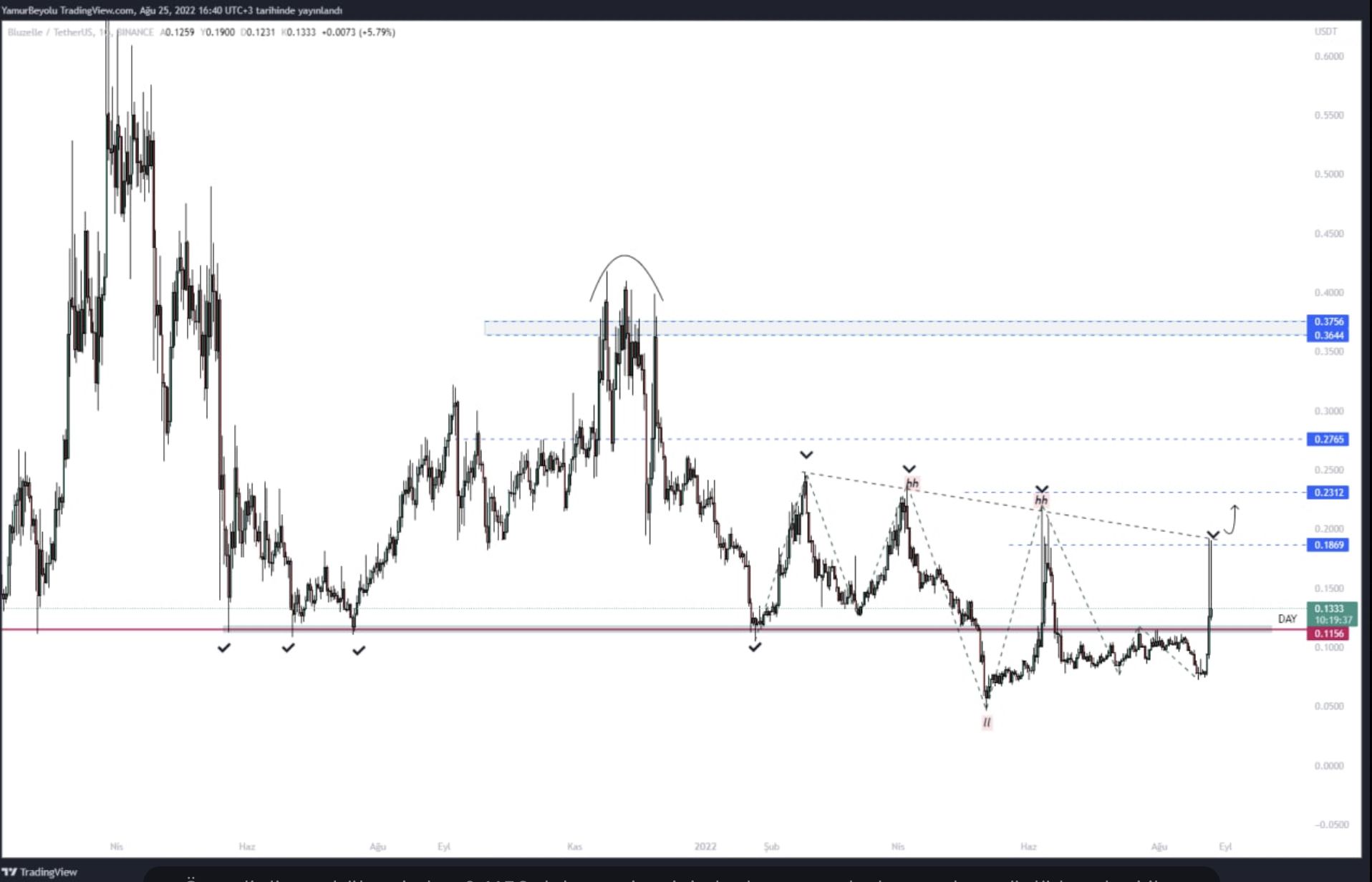 “Şuanki mevcut yapı ile en yakın destek seviyesi 0,1156 olup, bu önemli desteğin üzerinde kalması ve önemli direnç seviyesine fiyatın yukarı yönlü kırılım yapması durumunda, takip edilebilecek direnç seviyeleri 0,2312 0,2765 0,3644 dolarda yer alıyor.”