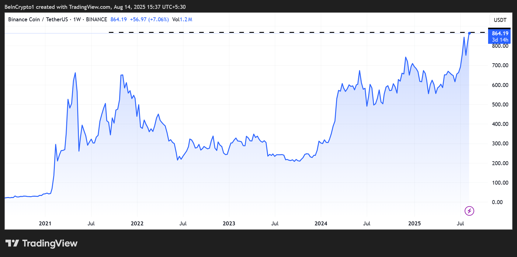 BNB, 868,79 Dolar ile yeni bir tüm zamanların en yüksek seviyesi (ATH) gördü ve psikolojik 1.000 Dolar seviyesine yaklaşmış durumda.