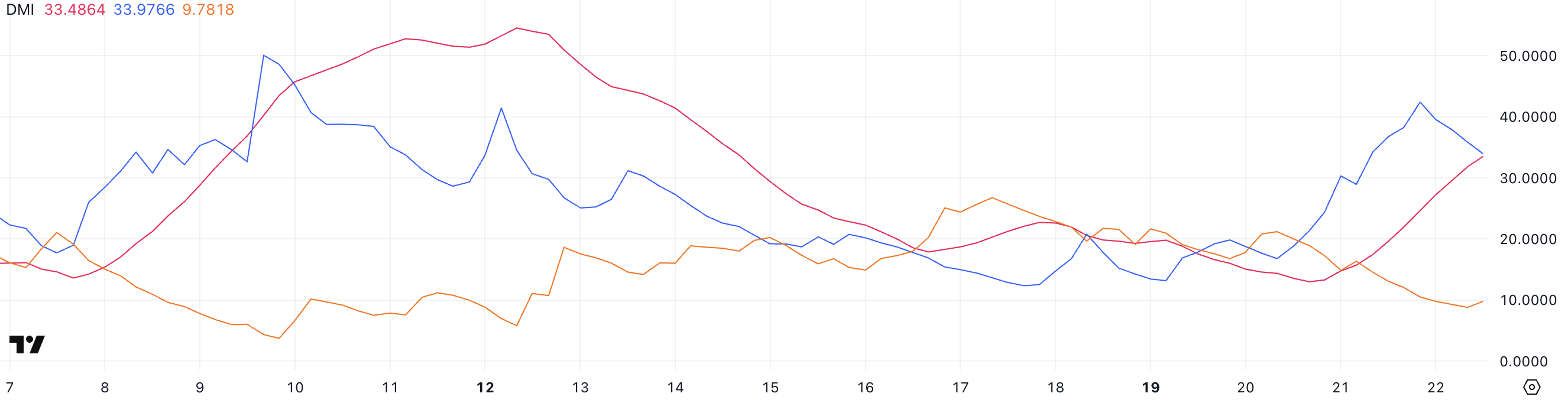 Boğa baskısını izleyen +DI, şu anda 33,97 seviyesinde—iki gün önce 21,3’tü ancak dün 42,41’den biraz düştü. Bu, alıcıların hala baskın olduğunu, ancak momentumun biraz soğuyabileceğini gösteriyor.