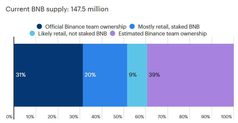 Zhao, BNB’ye sahip olduğu miktarı hiçbir zaman kamuya açıklamamış olsa da BNB’nin ilk para teklifinden (ICO) elde edilen 2017 teknik incelemesi kurucu ekibe 80 milyon token tahsis etti. Analizler, Binance’in bu tokenlerin 46,2 milyonunu elinde tuttuğunu gösteriyor.