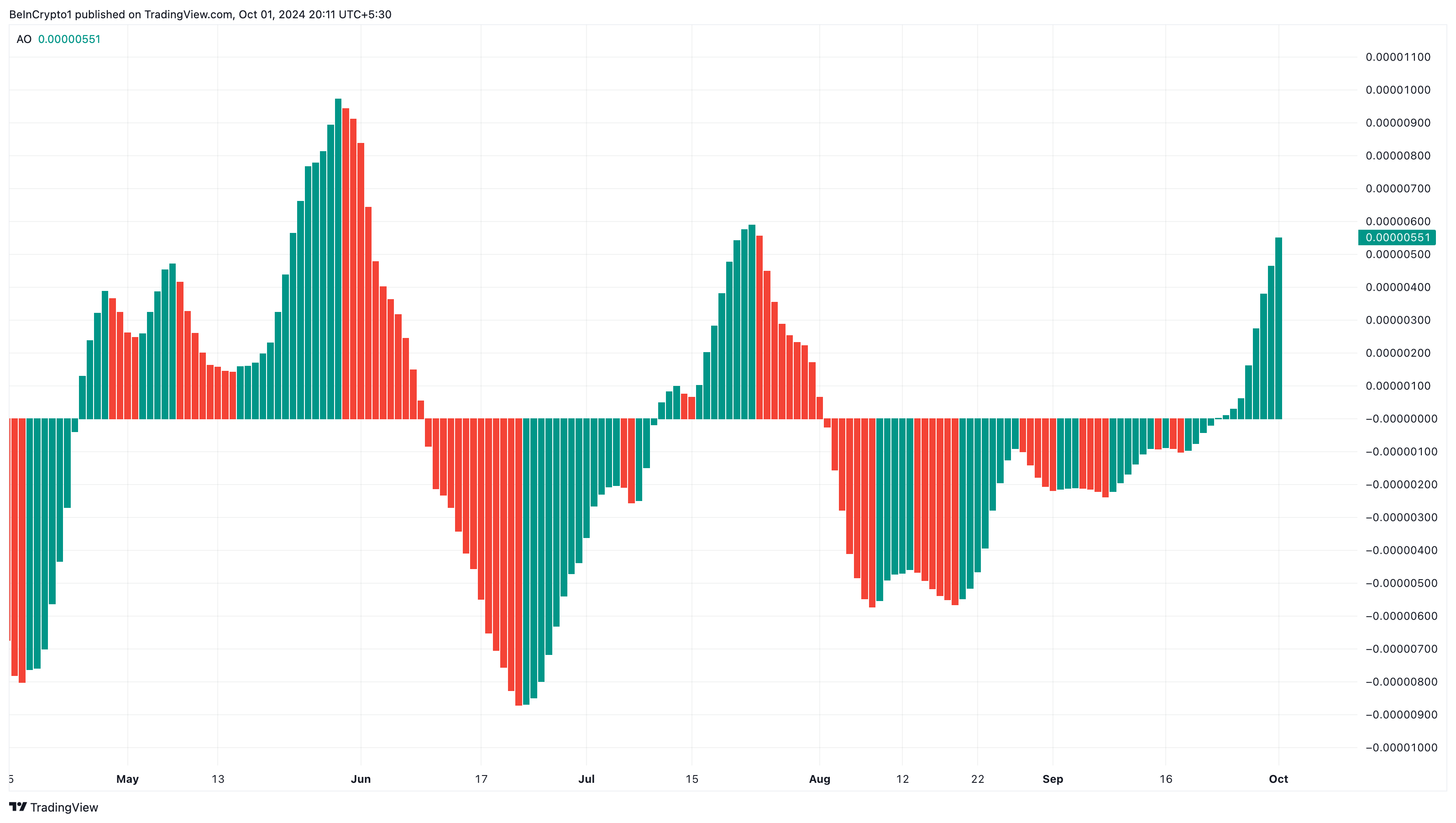 Bonk’un 0,000024 dolar seviyesinde işlem görmesiyle, günlük grafikteki Awesome Oscillator (AO) boğa piyasası görünümünü destekliyor. AO, son fiyat hareketlerini tarihsel eğilimlerle karşılaştıran ve momentumun boğa veya ayı olduğunu belirlemek için sıfır çizgisini kullanan bir momentum göstergesidir.