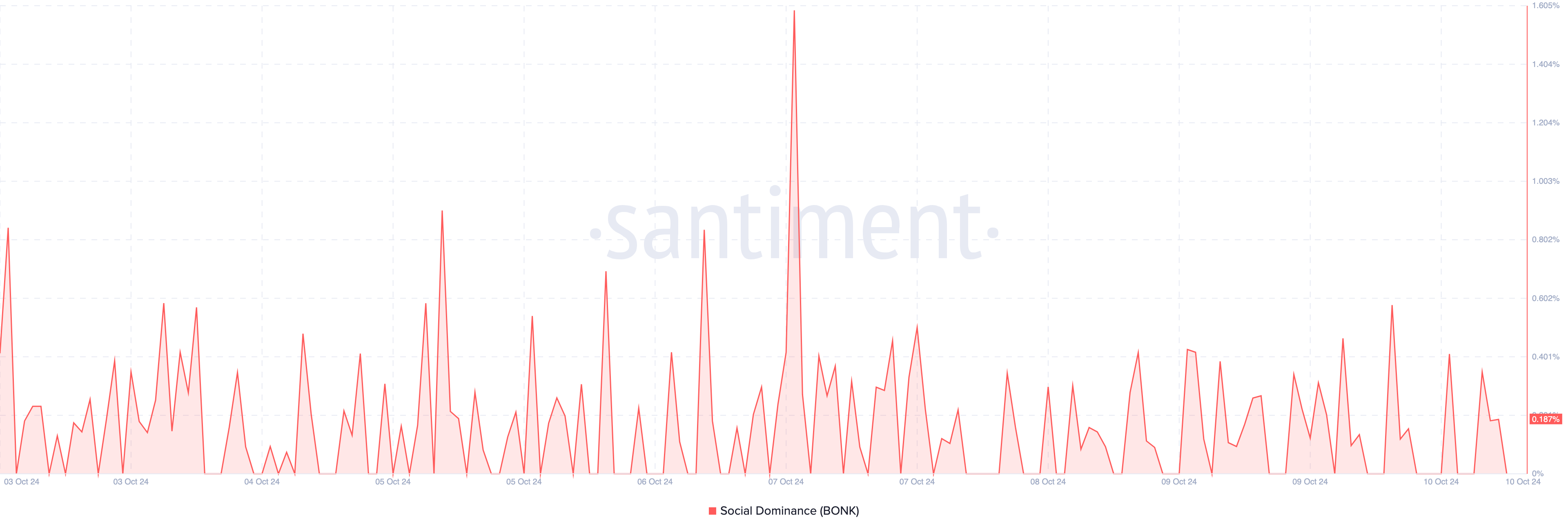 Bonk’un sosyal hakimiyeti, meme coin’in kaybedilen kazançları geri kazanmakta zorlanabileceğini öne süren faktörlerden biridir. Sosyal hakimiyet, bir kripto paranın ilgili tartışma oranını ölçer.