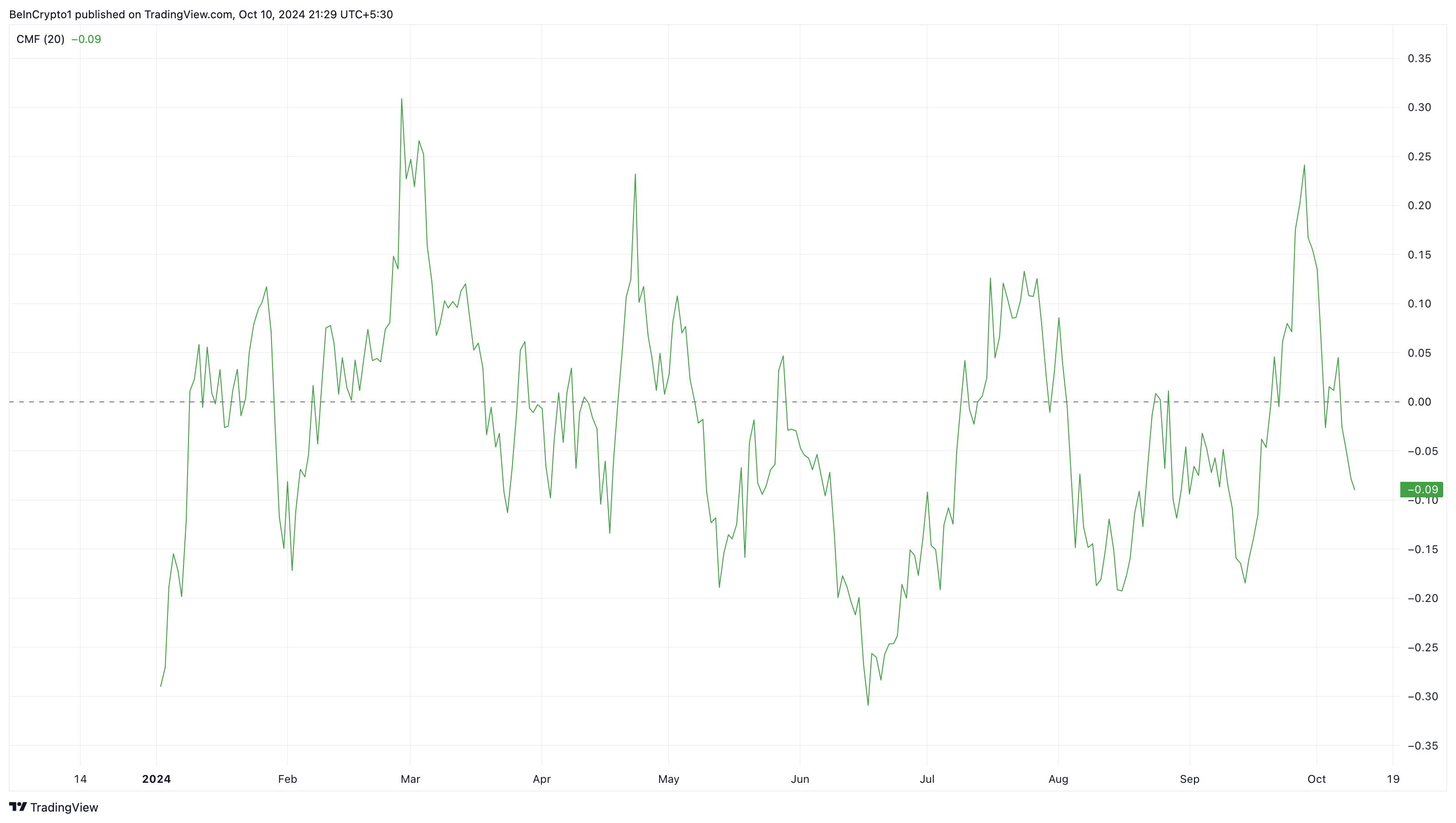 Ayrıca, BONK’un günlük grafiğindeki Chaikin Para Akışı (CMF), sıfır işaret çizgisinin altına düşerek şu anda -0.10’da. CMF, birikim ile dağıtımı ölçer, artış yüksek alım baskısını ve potansiyel fiyat artışını, azalış ise tam tersini işaret eder.