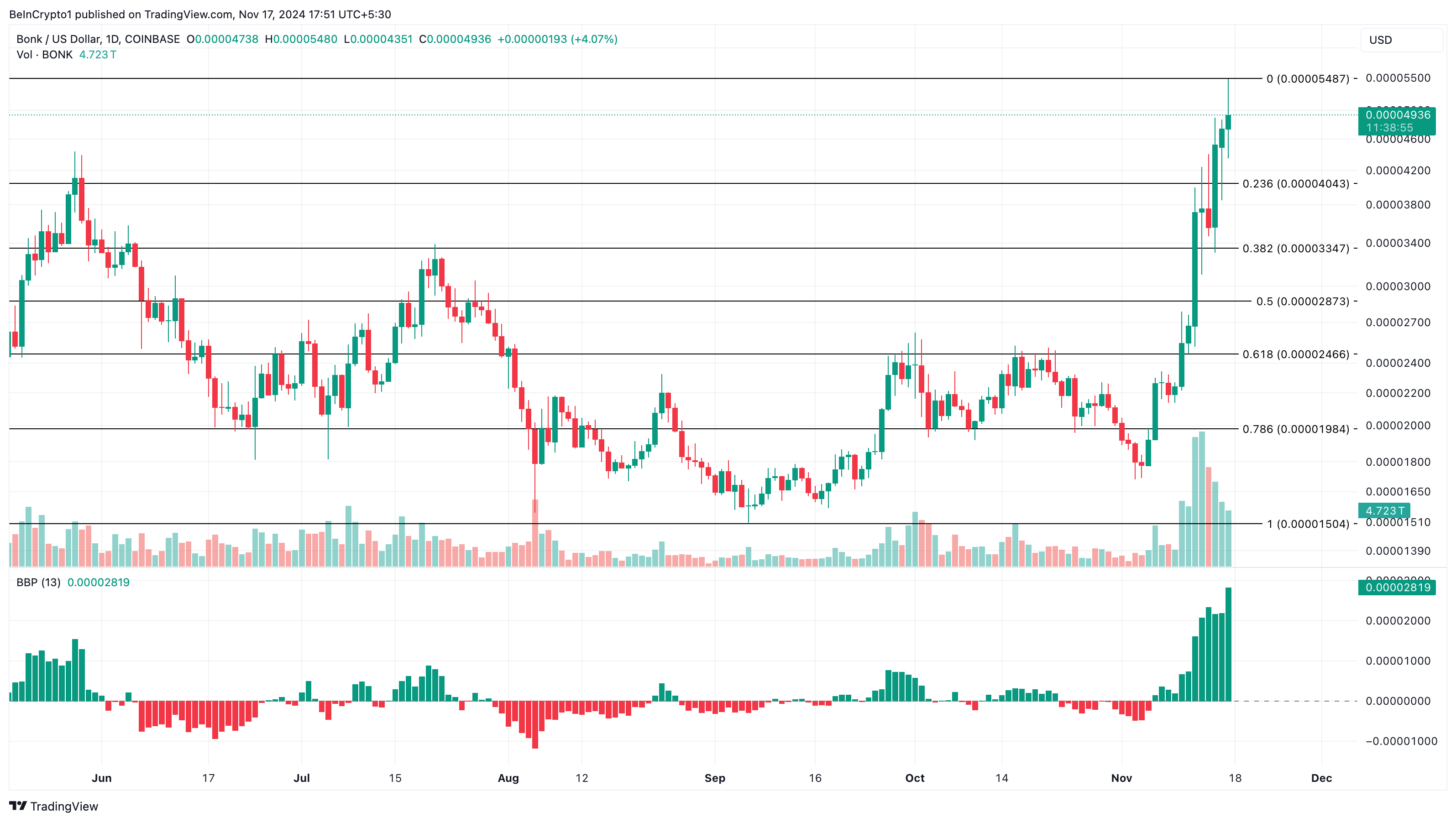 Şu anda BONK’ın fiyatı yaklaşık olarak 0,000050 dolar civarında, güçlü alım baskısıyla destekleniyor. Günlük grafik, alıcılarla satıcıların gücünü ölçen Boğa Ayı Gücü (BBP) göstergesinde önemli bir artışı ortaya koyuyor.
