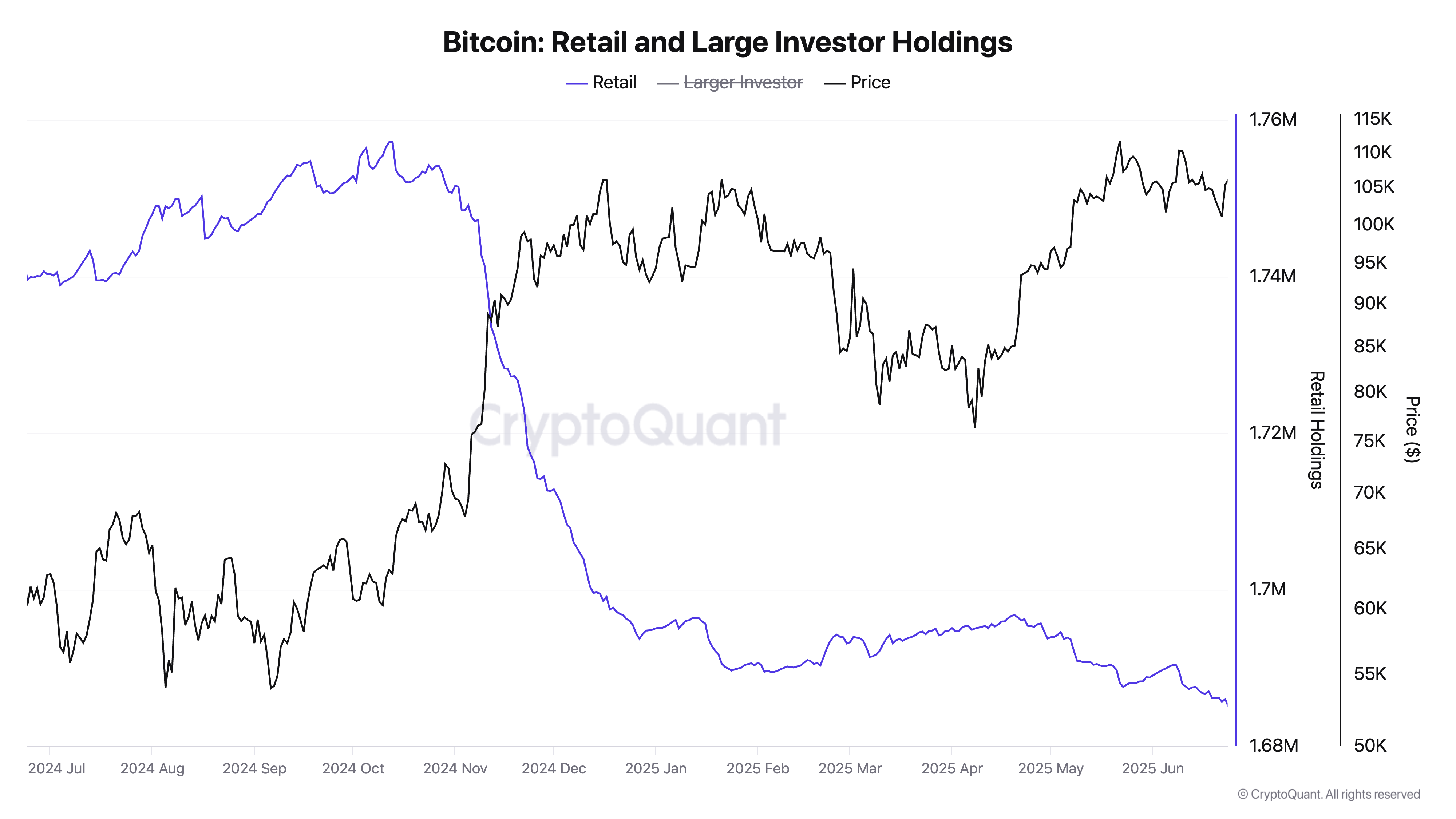 Pseudonymous CryptoQuant analisti IT Tech’in yakın tarihli bir raporuna göre, BTC büyük sahipleri genellikle balinalar, kurumlar ve fonlar, son bir yılda coin birikimlerini istikrarlı bir şekilde artırdı. Bu, bireysel yatırımcıların varlıklarını elden çıkarmaya devam ettiği trendle keskin bir tezat oluşturuyor.