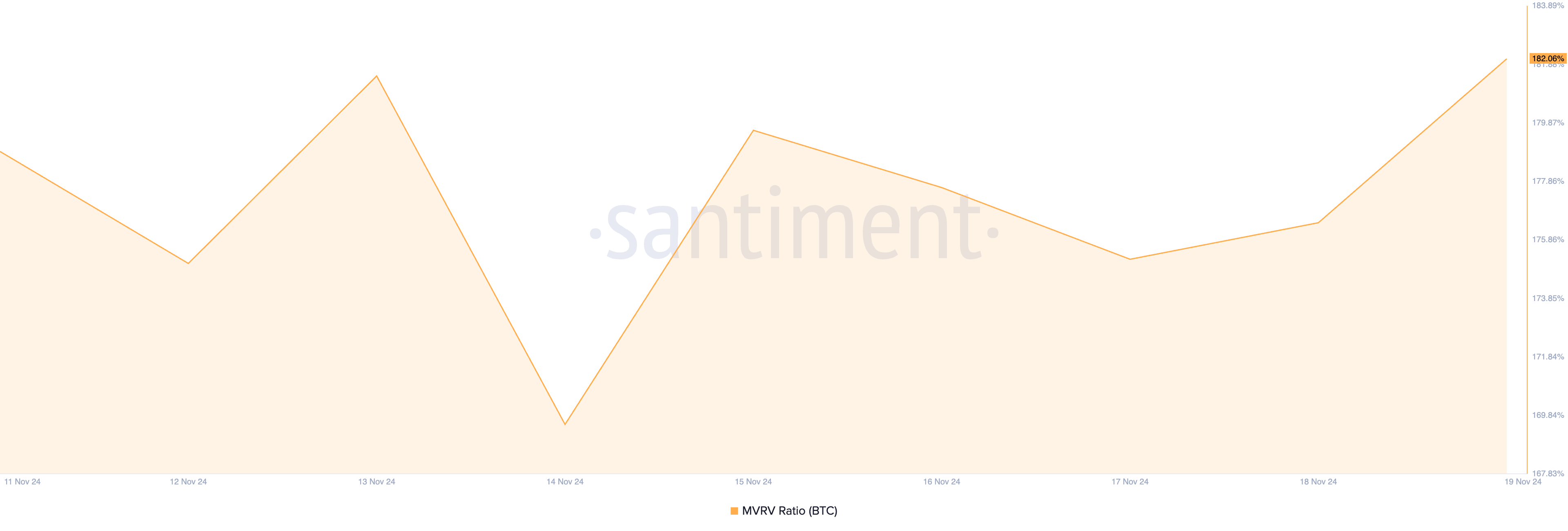 Ayrıca, BTC’nin piyasa değeri ile gerçekleşen değeri (MVRV) oranı, coin’in aşırı değerlendiğini öne sürerek daha fazla sahibinin satış yapmasını teşvik ediyor. Santiment’in verilerine göre, BTC’nin mevcut MVRV oranı %182,06’dır.
