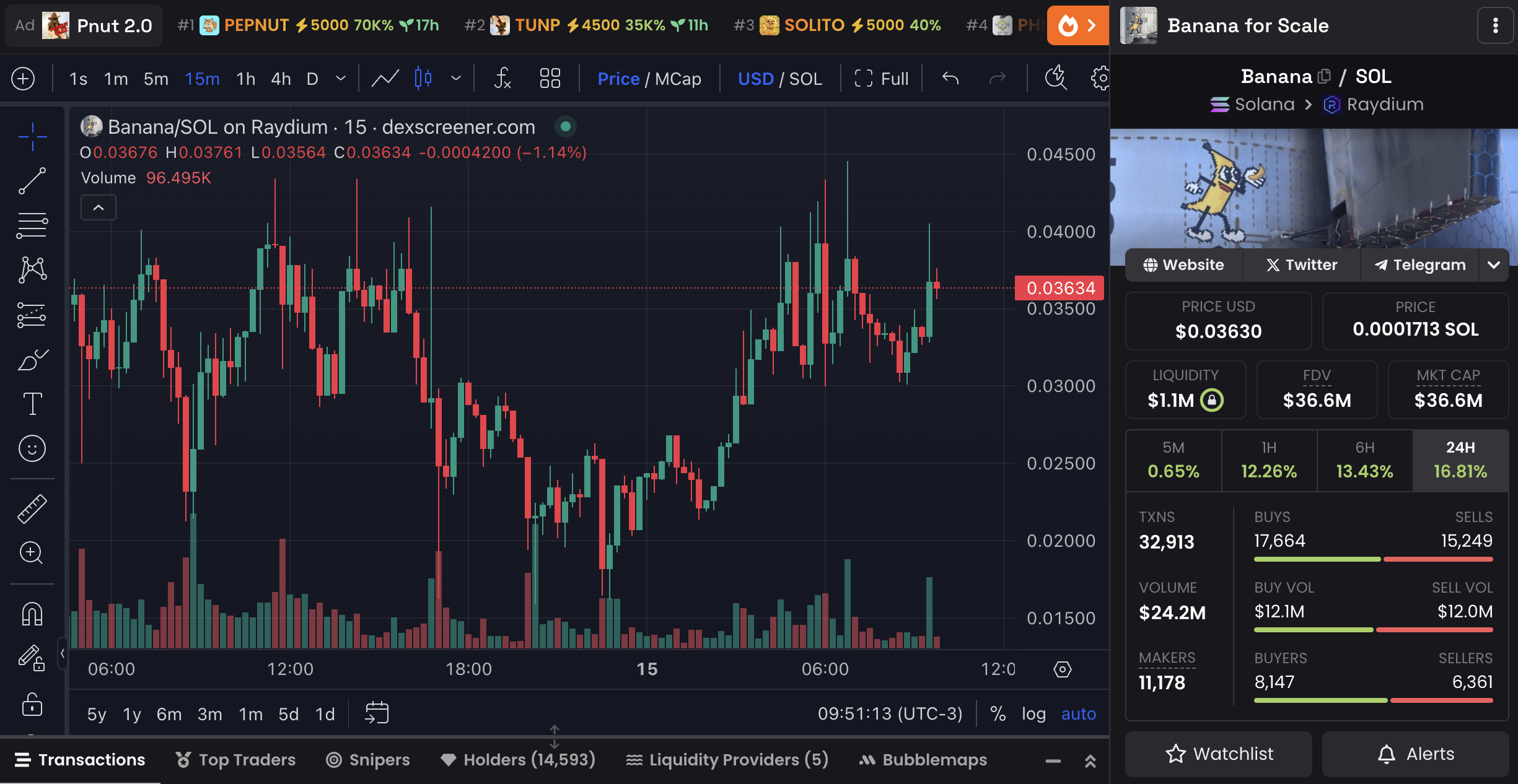Banana da Solana ekosisteminde yer alıyor ve yalnızca üç gün önce Pumpfun üzerinde piyasaya sürüldü. Token, şu anda 36,6 milyon dolarlık bir piyasa değerine sahip. Ayrıca sadece birkaç gün içinde 14.000’den fazla sahibi çekmeyi başardı.