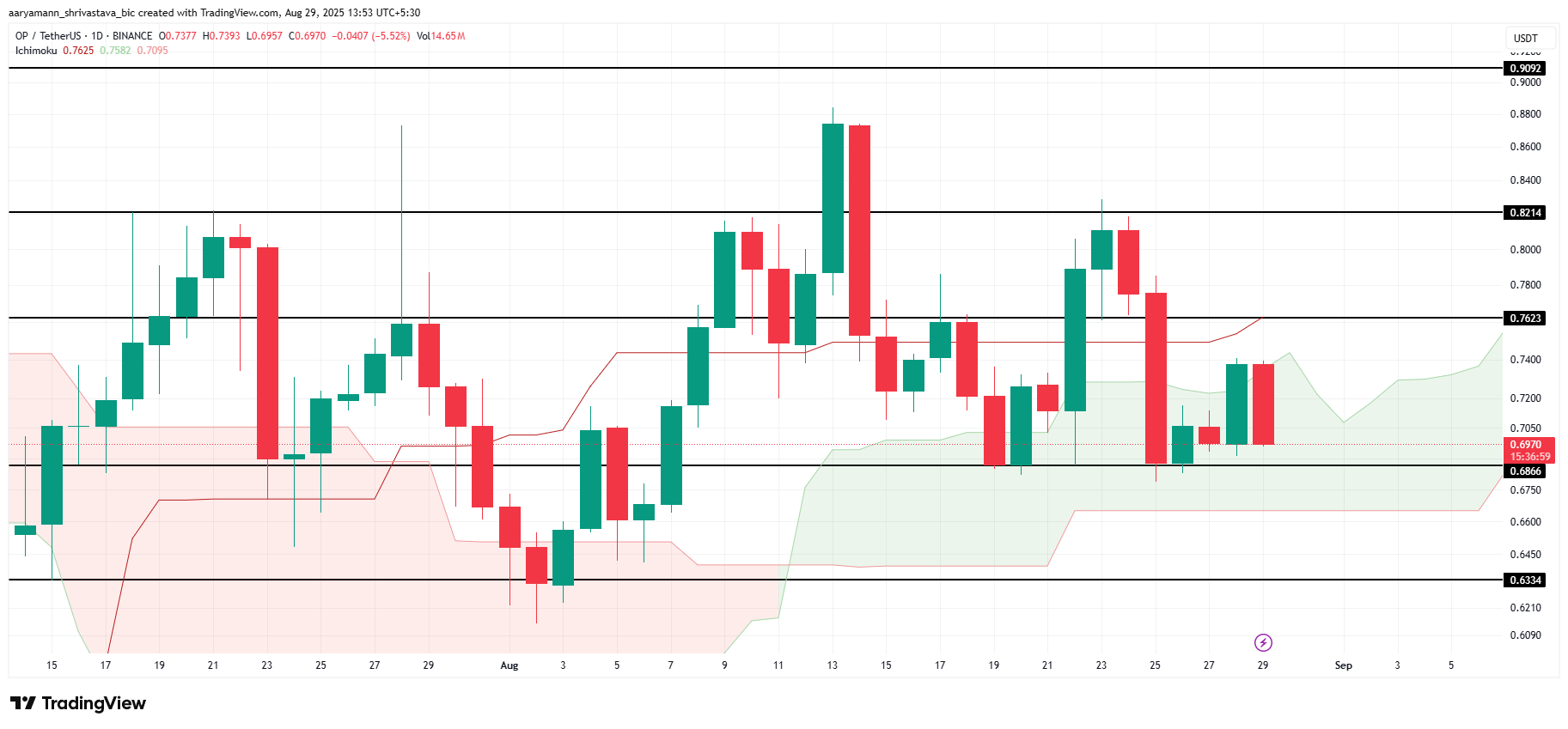 OP, yazı yazıldığı sırada 0,697 Dolar’dan işlem görüyor ve 0,68 Dolar destek seviyesinin üzerinde tutunuyor. Ichimoku Bulutu, yükseliş yönlü bir sinyal veriyor ve Optimism’in kısa vadeli istikrarını koruyabileceğini öne sürüyor. Bu gösterge, devam eden piyasa ilgisini yansıtıyor ve altcoin’in daha geniş piyasa baskılarına rağmen ayakta kalma çabalarına destek sağlıyor.