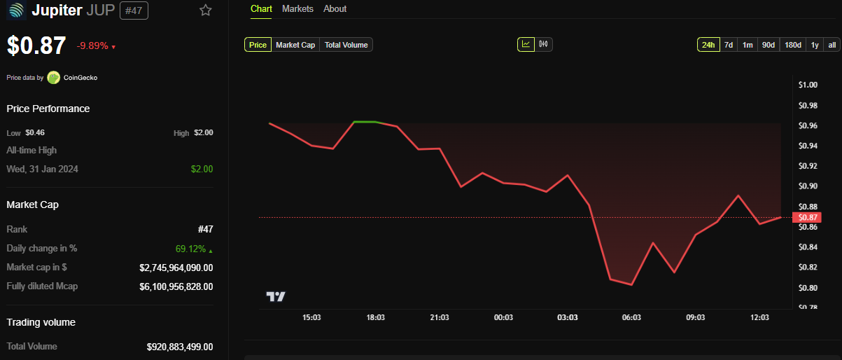 Jupiter’in JUP token’ı neredeyse %10 düştü. BeInCrypto verileri, basın zamanında 0,87 Dolar’dan işlem gördüğünü gösteriyor.