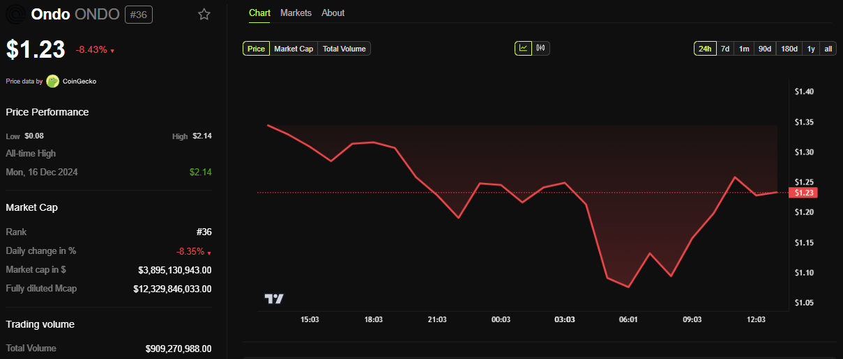 Etkinlik için beklentiye rağmen, Ondo Finance’in token fiyatı %8’den fazla düşmüş durumda. BeInCrypto verileri gösteriyor ki, bu yazı itibarıyla ONDO 1,23 Dolar’dan işlem görüyor.