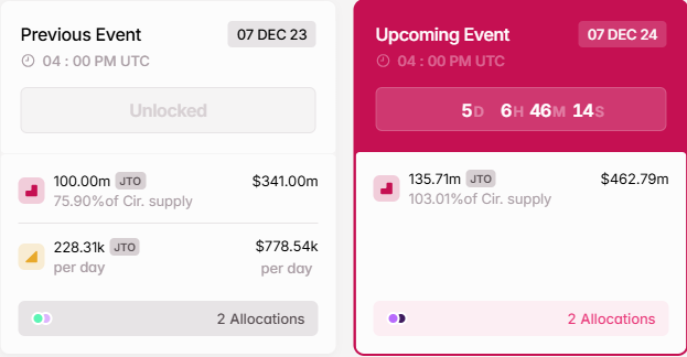 7 Aralık’ta, Jito Network, mevcut oranlarda yaklaşık 462 milyon dolar değerinde 135,71 milyon JTO token’ını serbest bırakacak. Token’lar, dolaşımdaki arzının %103,01’ini oluşturuyor ve bu durum piyasayı zayıflatabilir ve fiyat düşüşüne neden olabilir. BeInCrypto’nun bildirdiğine göre, token’lar çekirdek katkıda bulunanlara ve yatırımcılara tahsis edilecek. Çekirdek katkıda bulunanların aksine, yatırımcılar erken kazançlar için nakde çevirebilir.