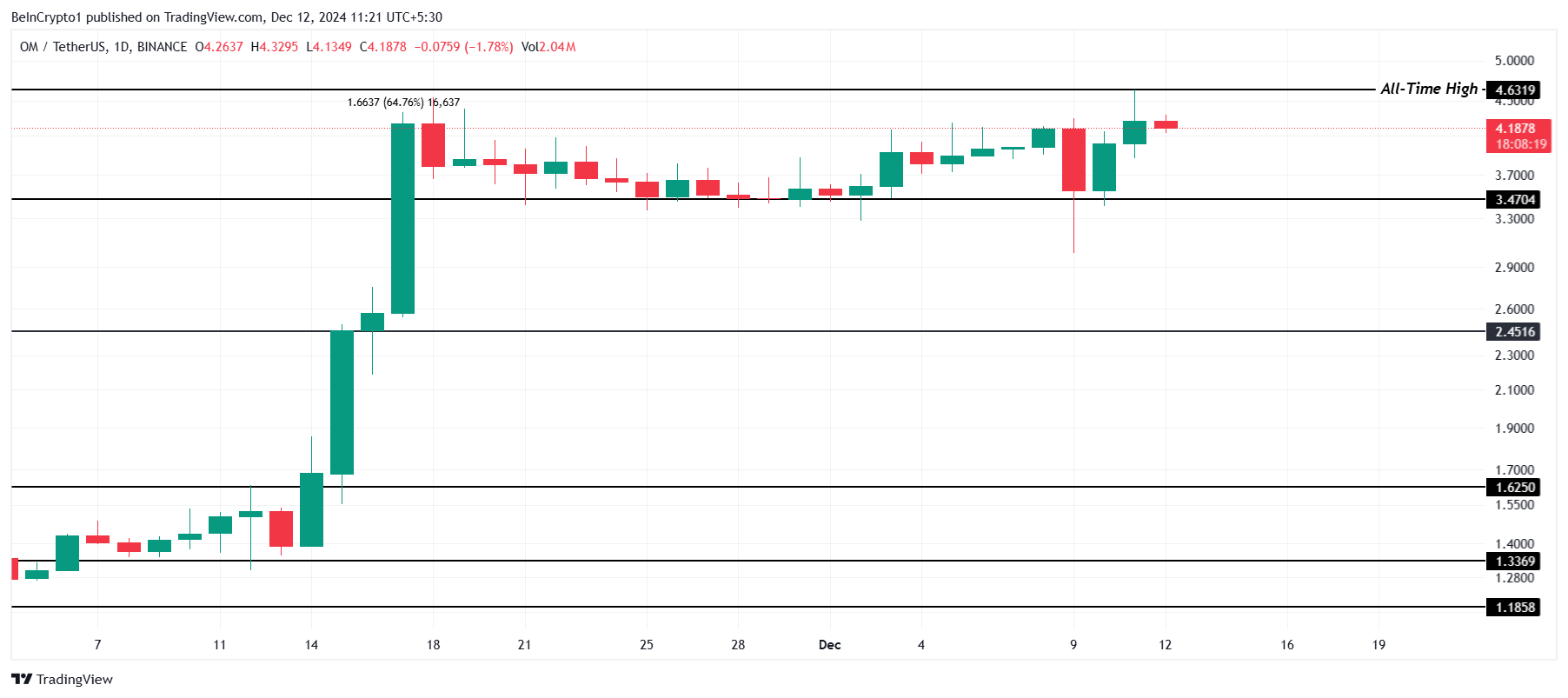 OM fiyatı, tek bir günde %64’lük büyük bir fiyat artışının ardından üç haftadan fazla bir süredir yatay bir trendde sıkışmış durumda. Altcoin’in fiyat hareketi net bir yön eksikliği gösteriyor, çünkü trader’lar daha geniş piyasa belirsizliği nedeniyle temkinli görünüyor. Bu konsolidasyondan yakında bir çıkış bekleniyor.