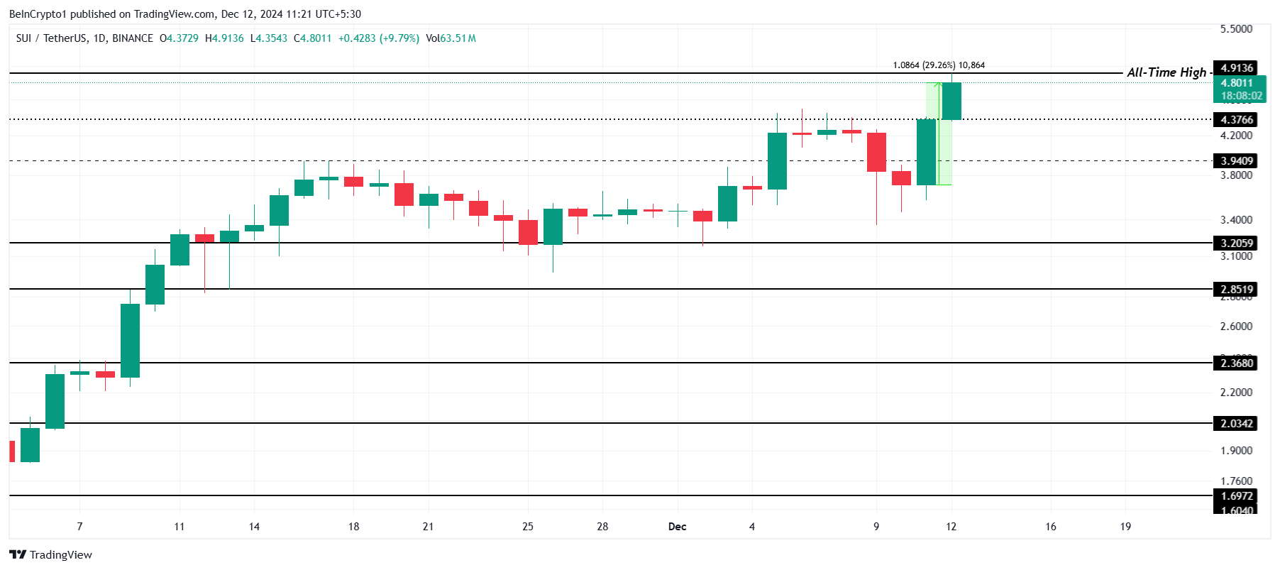 SUI fiyatı son 24 saatte %29 artarak 4,80 dolara ulaştı. Altcoin, bugünkü seans sırasında 4,91 dolar ile yeni bir tüm zamanların en yüksek seviyesine (ATH) ulaştı. Bu keskin yükseliş, güçlü yatırımcı ilgisini ve piyasa ivmesini gösteriyor, SUI mevcut boğa ortamında iyi performans sergiliyor.
