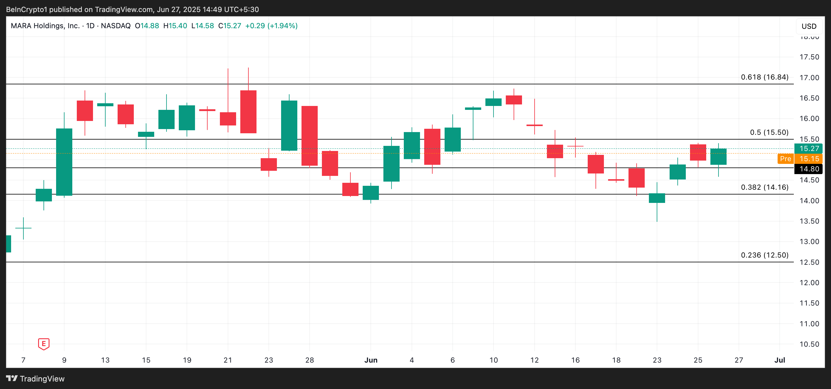 MARA, bugün izlenmesi gereken bir diğer kripto para hissesi olarak, büyük bir stratejik duyurudan ivme kazanıyor. Hisse dün 15,27 Dolar’dan kapanarak %1,80 artış gösterdi ve son ortaklığına dair yatırımcı iyimserliğiyle desteklendi.