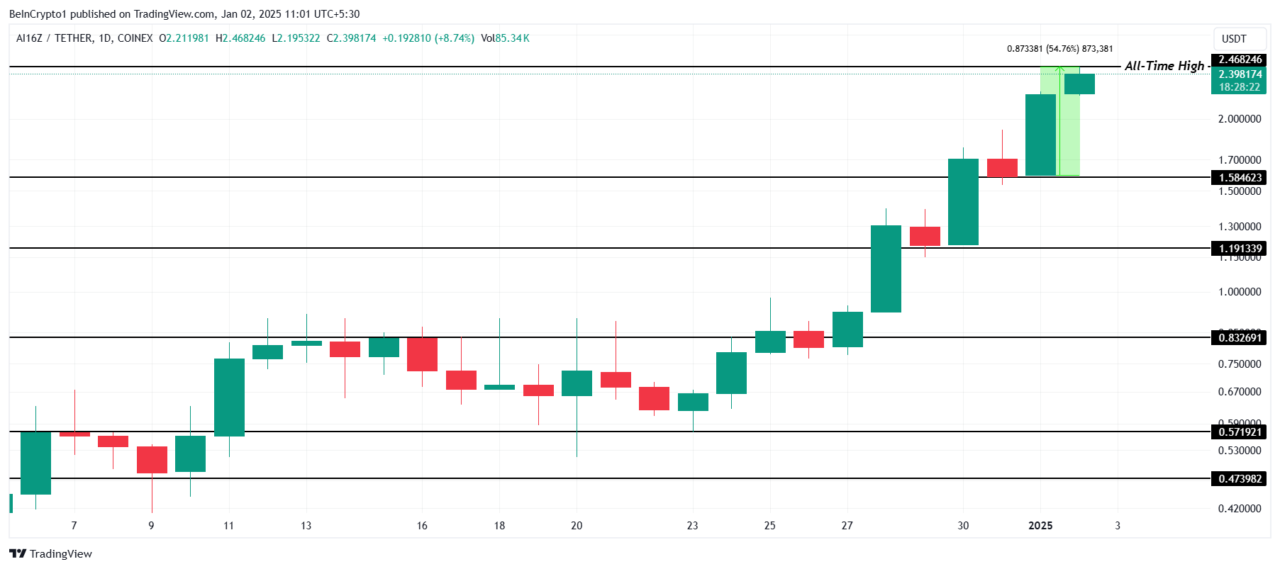 AI16Z %54 arttı ve günün en iyi performans gösteren token’larından biri olarak öne çıktı. Coin 2,46 dolar ile yeni bir tüm zamanların en yüksek seviyesine ulaştı. Kripto para, 1,58 dolar seviyesindeki kritik destek seviyesinin üzerinde konumunu koruyarak yatırımcı güvenini pekiştiriyor. Bu yukarı yönlü ivme, AI16Z’yi piyasada öne çıkan bir unsur olarak daha da vurguladı.