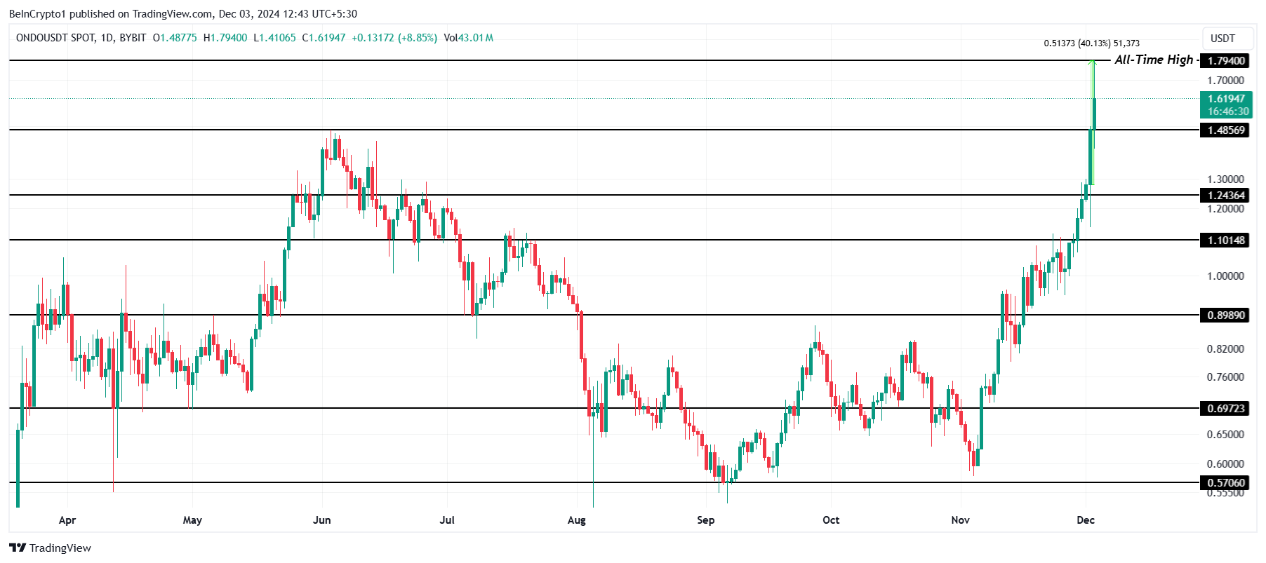 ONDO’nun fiyatı son 24 saatte %40 artarak 1,794 dolar ile yeni bir tüm zamanların en yüksek seviyesine (ATH) ulaştı. Bu, altı ay içindeki ilk ATH’yi işaret ediyor ve güçlü piyasa ilgisini gösteriyor. Fiyat artışı, ONDO’yu hem yatırımcıların hem de trader’ların dikkatine çekti.
