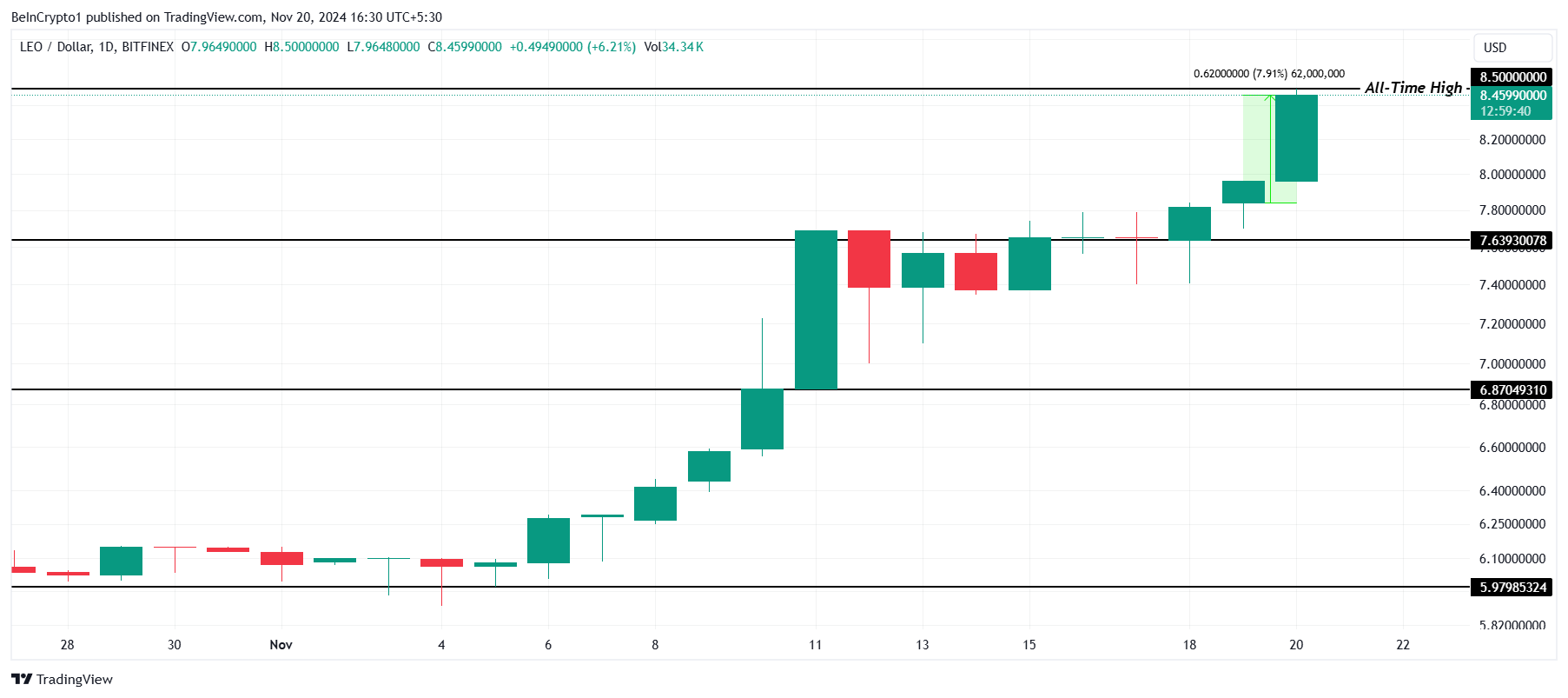 LEO, yeni bir tüm zamanların en yüksek seviyesine 8,50 dolarla ulaştı. Günün en iyi performans gösterenleri arasında yer almasa da son 24 saatte neredeyse %8 arttı. Altcoin’in istikrarlı büyümesi, artan yatırımcı güvenini ve dalgalı bir piyasada yukarı yönlü ivmeyi sürdürme potansiyelini yansıtıyor.