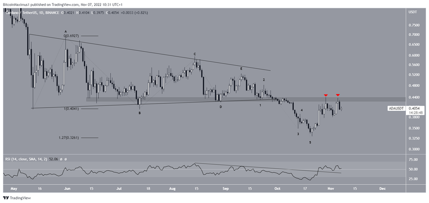 Cardano fiyatı, Ağustos 2021’de 3,10 dolara ulaşarak zirveyi gördükten sonra düşüşe geçti. Bu düşüşten önce haftalık RSI’da negatif uyumsuzluk ortaya çıktı (siyah çizgi). Aşağı yönlü hareket sonucunda Ekim 2022’de 0,33 dolar görüldü.
