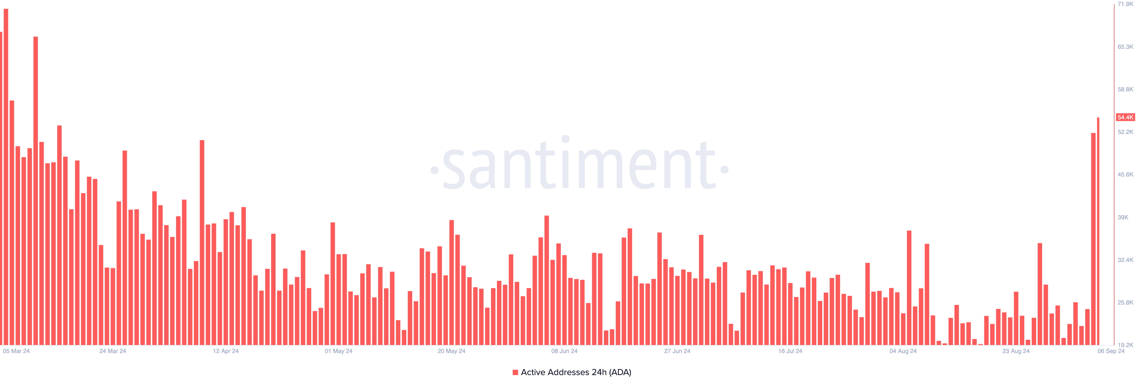 ADA’nın zaman tüketimindeki artış, şu anda altcoini trade eden aktif adreslerin sayısındaki artışla eşlik ediyor. Santiment’in verilerine göre, ADA işlemlerine dahil olan adreslerin sayısı 54.200’e ulaştı. Bu ADA’nın 6 Mart’tan bu yana en yüksek günlük sayıya ulaştığı noktadır.