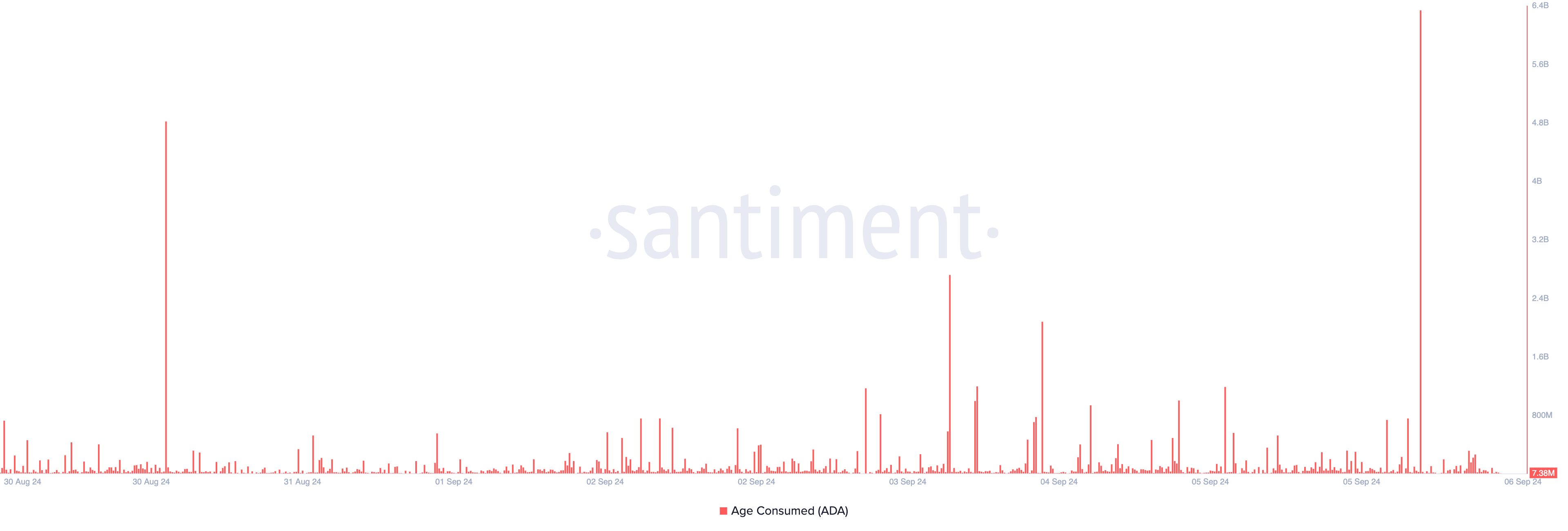 Santiment’in verilerine göre, ADA’nın zaman tüketimi (age consumed) Cuma sabahı 6,33 milyar ile yedi günlük en yüksek seviyesine ulaştı. Bu metrik, uzun süre tutulan coin’lerin hareketini izler. Bu nedenle artış olduğunda dikkate değerdir. Çünkü uzun vadeli sahipler nadiren coin’lerini hareket ettirir. Yaptıklarında ise, genellikle piyasa trendlerinde bir değişiklik öncesidir.