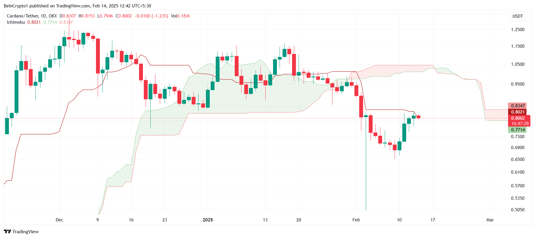 Cardano’nun genel makro momentumu hala özellikle Ichimoku Bulutu gibi teknik göstergeler analiz edildiğinde düşüş sinyalleri tarafından etkileniyor. Şu anda, bulut ve temel çizgi mum çubuklarının üzerinde geziniyor, bu da önümüzdeki günlerde potansiyel direnç sinyali veriyor. Bu direnç, ADA’nın daha yüksek seviyelere çıkma çabalarını geciktirebilir.