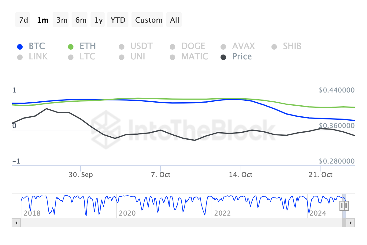 Sponsored SponsoredBu, IntoTheBlock’tan 30 günlük korelasyon matrisi tarafından da desteklenmektedir. Korelasyon matrisi, -1 ile +1 arasında değişen bir korelasyon katsayısıdır, -1’e yakın değerler iki kripto paranın fiyatlarının nadiren birlikte hareket ettiğini gösterir.