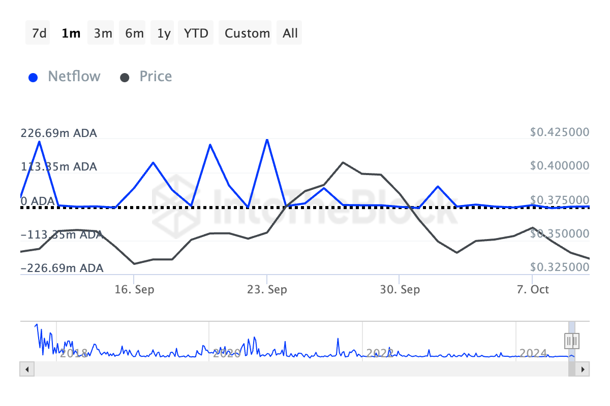 IntoTheBlock verileri, geçtiğimiz ay Cardano’daki balina aktivitesinde önemli bir düşüş olduğunu gösteriyor. Son 30 gün içinde ADA balinaları ya da büyük yatırımcılar, ADA’nın büyük sahiplerinin net akışındaki %100’lük düşüşle coin’lerini artan bir şekilde satmış.