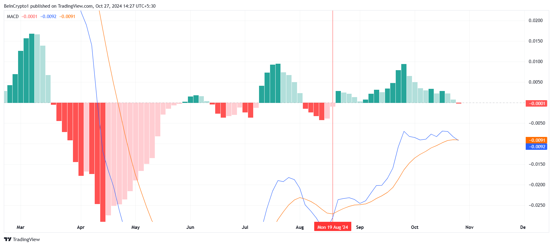 Cardano’nun makro momentumu son zamanlarda değişti, Hareketli Ortalama Yakınsama Iraksama (MACD) gibi teknik göstergeler boğa döneminin sona erdiğini işaret ediyor. İki aydan fazla süren pozitif hareketin ardından MACD, Ağustos ortasından bu yana ilk ayı geçişini kaydetti. Bu değişiklik, yukarı yönlü ivmenin kaybını yansıtıyor ve devam eden bir düşüş eğiliminin olasılığını ortaya koyuyor.