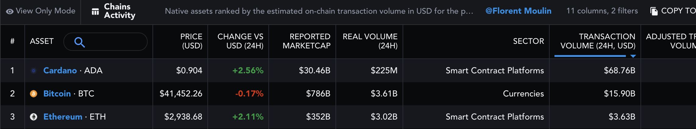 Kripto para veri izleme platformu olan Messari.io, Cardano blockchaininden pozitif veriler geldiğini bildirdi. Veri izleme platformu, ADA’nın ayarlanmış işlem hacmi açısından Bitcoin ve Ethereum’u başarıyla geçtiğini duyurdu. Gelen on-chain verilere göre, ADA 68 milyar dolar kazanırken, Bitcoin ve Ethereum’un toplam hacmi yalnızca 8 milyar dolarda kaldı.