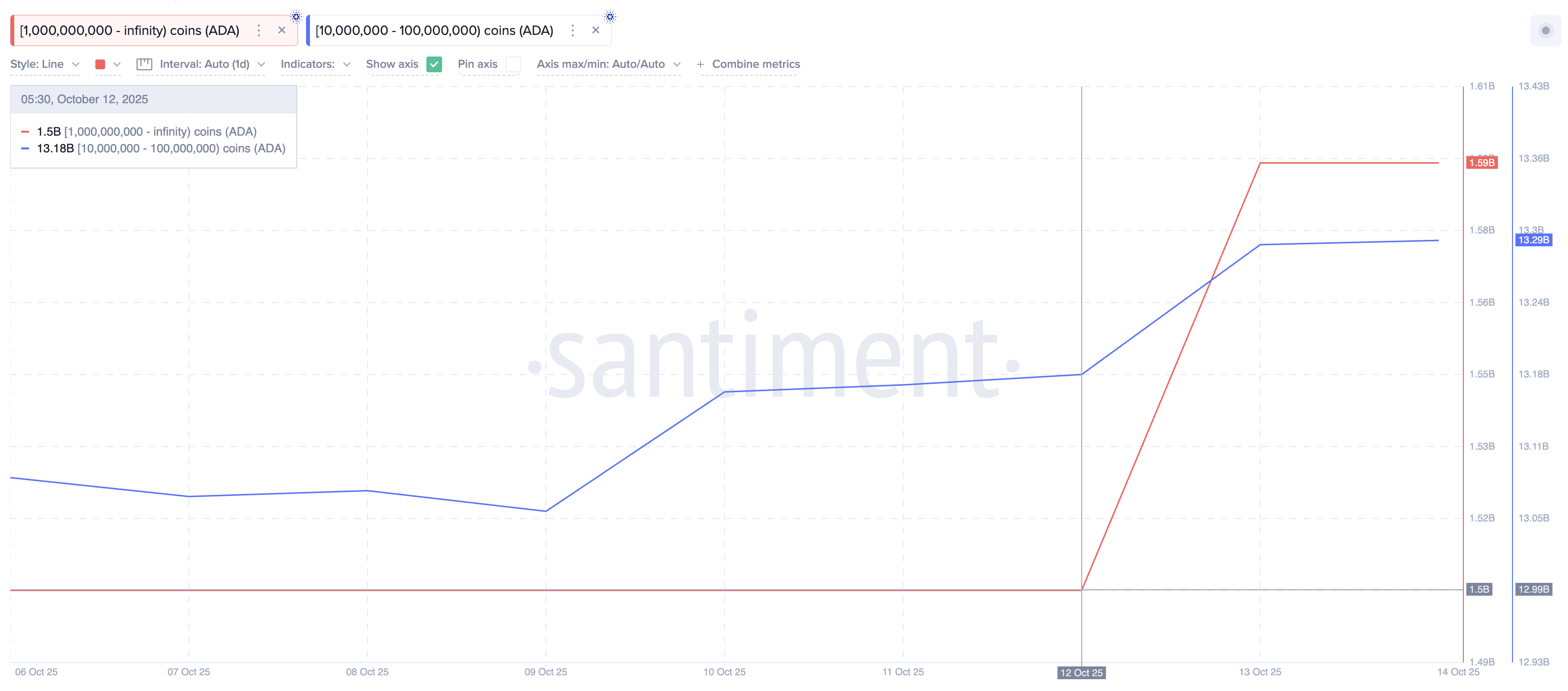 12 Ekim’den bu yana yeni balina aktiviteleri ortaya çıktı ve çöküşün hemen ardından mega sahiplerden görülen önceki alımlara eklendi. Santiment verileri, 1 milyar ADA’dan fazla tutan cüzdanların (mega balinalar) bakiyelerini 1,50 milyardan 1,59 milyar ADA’ya çıkardığını, 10 milyon ila 100 milyon ADA aralığındaki cüzdanların ise 13,18 milyardan 13,29 milyar ADA’ya yükseldiğini gösteriyor.