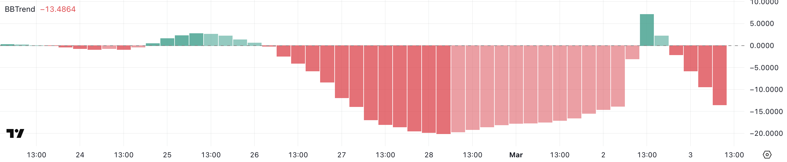 7,1’deki zirvesinin ardından, ADA’nın BBTrend göstergesi tersine dönerek -13,4’e geriledi ve ABD kripto para rezervine dahil edilmesiyle ilgili ilk heyecanın azaldığını gösterdi.