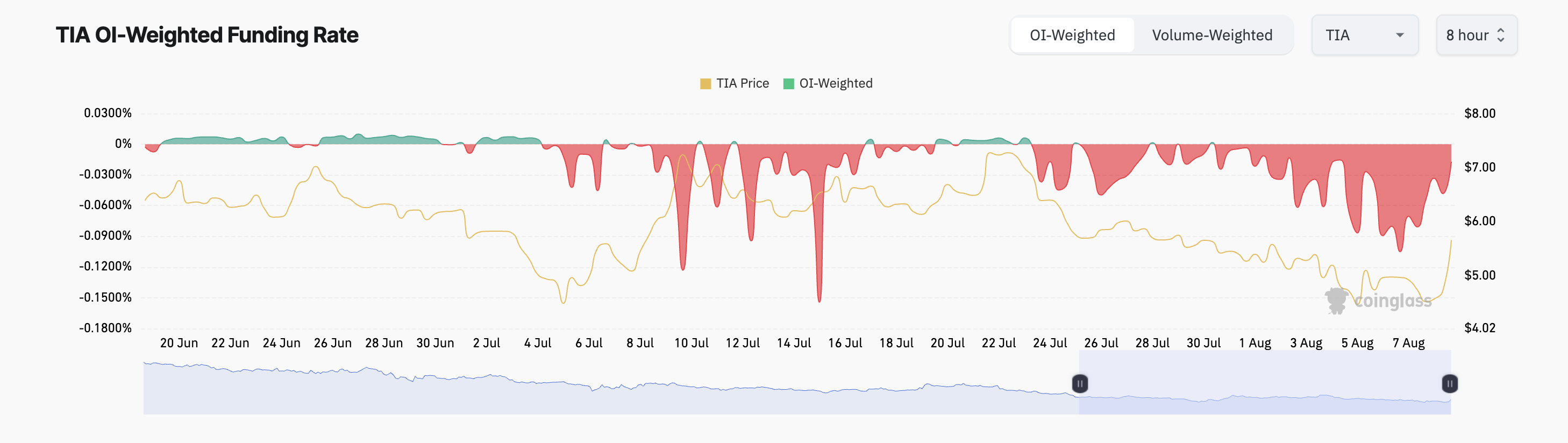 Sürekli vadeli işlem sözleşmelerindeki fonlama oranları, sözleşme fiyatını spot fiyatla uyumlu tutmak için kullanılır. Coinglass, TIA’nın fonlama oranlarının 23 Temmuz’dan bu yana negatif kaldığını ve şu anda -%0,017’de oturduğunu gösteriyor.