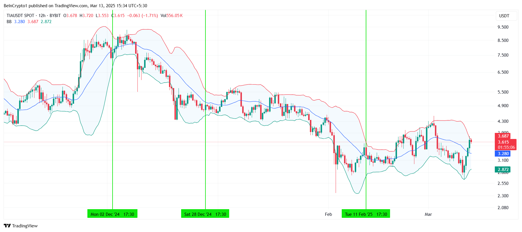 Bollinger Bantları sıkışmaya doğru ilerliyor, bu da Celestia’nın fiyatındaki volatilitenin sona erebileceğini gösteriyor. Tarihsel olarak, bu tür sıkışmalar genellikle fiyatın yatay hareket ettiği fiyat istikrarı dönemleriyle takip edilmiştir.