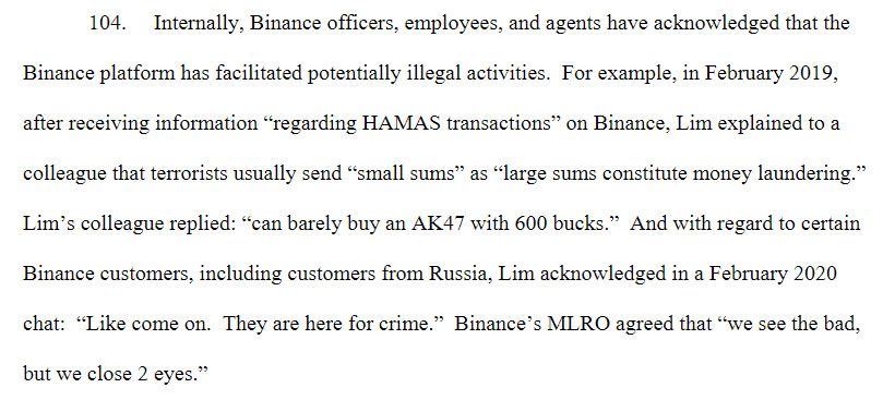 Kara Para Aklama: Düzenleyici kurumun üzerinde durduğu konu başlıklarından birisi Kara Para Aklama (AML) konusu oldu. Dosyaya göre dev borsa, kullanıcılarının kara para aklamasını önlemeye yönelik güçlü önlemler almadı. Şirketin yöneticileri Changpeng Zhao ve Samuel Lim bu kuralları görmezden geldi.