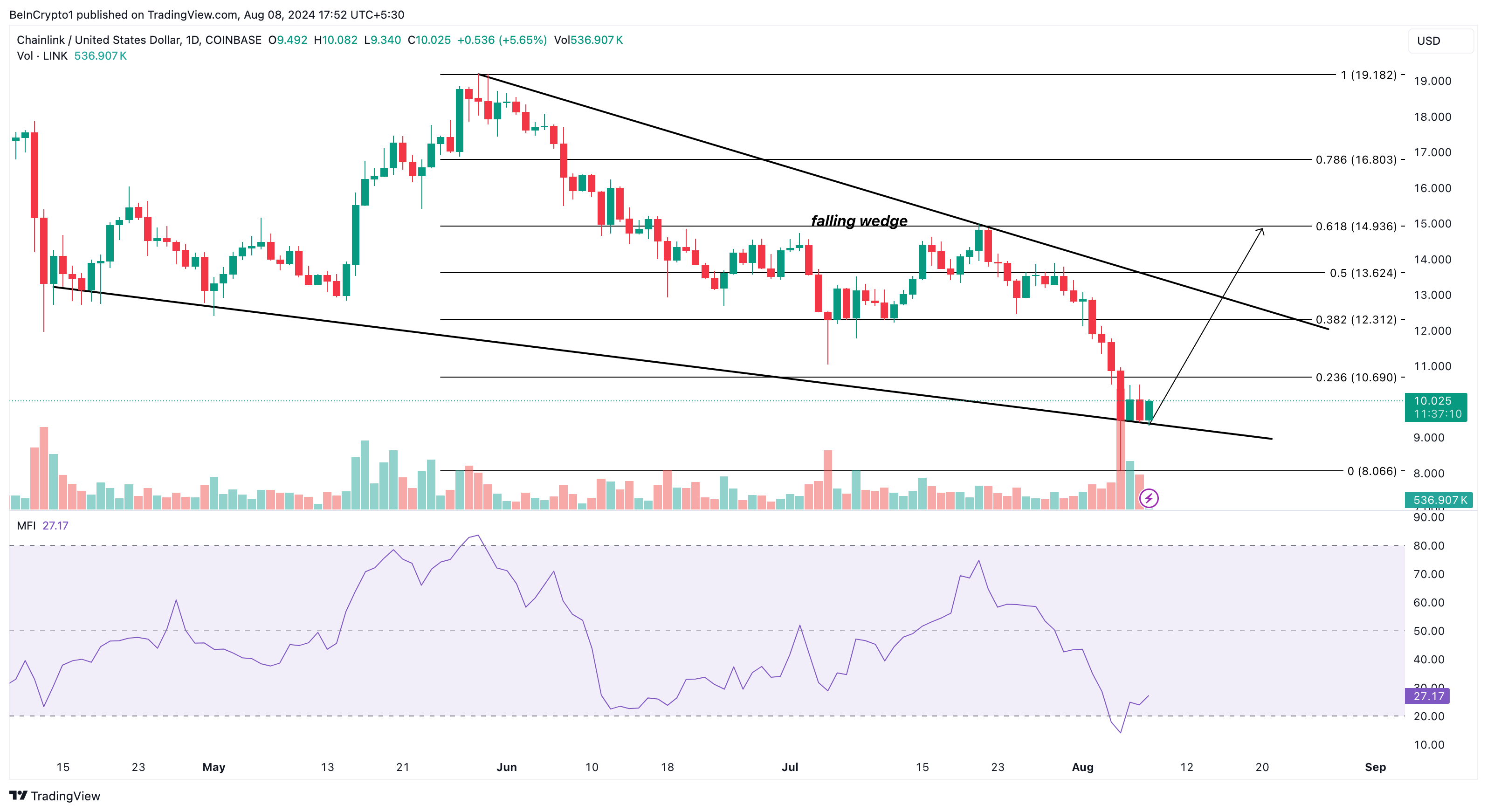 Chainlink’in teknik kurulumu, yükseliş tahminiyle aynı fikirde görünüyor. Bu iddianın bir nedeni, günlük grafikte düşen kama oluşumudur. Genel olarak, düşen bir takoz, satıcıların ivme kaybettiğini ve alıcıların yavaş yavaş yorgunluktan yararlandığını işaret ettiği için düşüş trendinin sona erdiğini gösterir .