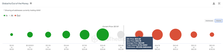 Bunun nedeni, Global In/Out of the Money (GIOM) göstergesine göre, 29 ila 34 dolar arasında yaklaşık 11 milyon AVAX satın alınmış olmasıdır. 358 milyon doların üzerinde değere sahip olan bu arz, Avalanche’ın fiyatı 34 doları aştığında karlı hale gelecektir.