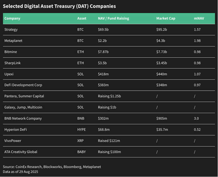 Temmuz ayında CoinEx Araştırma, Ethereum odaklı Dijital Varlık Hazinesi (DAT) firmalarının yükselişine dikkat çekmişti. Ağustos ayına gelindiğinde sektör hızla genişledi; Pantera Capital ve Galaxy Digital gibi şirketler Solana hazineleri için fon toplarken diğerleri de BNB, XRP, HYPE ve BABY gibi varlıklara yöneldi. Bu çeşitlilik, altcoin’lere yönelik artan iştahı yansıtıyor ve yerel firmalar piyasa ile düzenleyici koşullara uyum sağladıkça bölgesel farklılıkların ortaya çıkması bekleniyor. Ancak bazı DAT’lar için piyasa Net Varlık Değeri (mNAV) çarpanlarının kazançlı primlerden yaklaşık 1.0x seviyelerine düşmesi, rekabet arttıkça ve yatırımcı hissiyatı normalleştikçe değerlemelerin baskı altına girebileceğini gösteriyor.