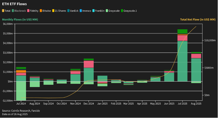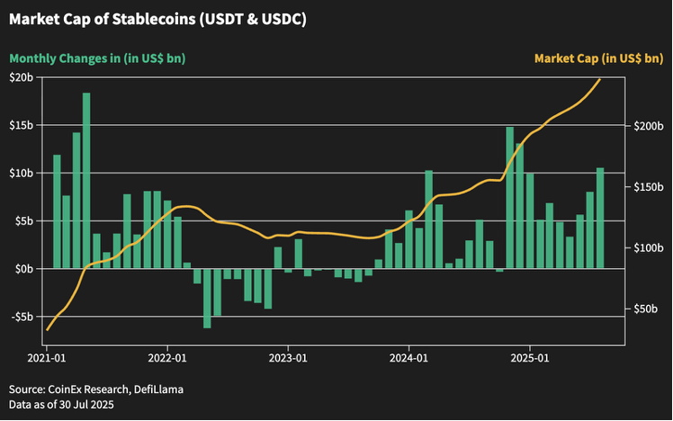 Stablecoin girişleri Ağustos ayında 10 milyar Doları aştı; bu, son sekiz aydaki en hızlı artış oldu. Bu yükseliş, artan likiditeyi, artan sermaye dağılımını ve sürekli yatırımcı katılımını yansıtıyor. CoinEx Araştırma, bunu boğa piyasası yapısının sağlam kaldığının bir teyidi olarak yorumluyor.