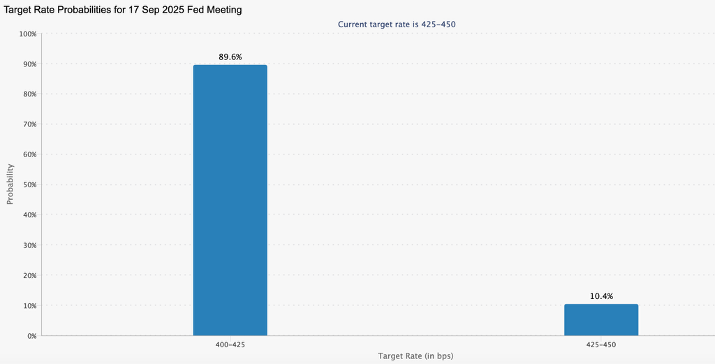 Bitcoin ayı 108.000 Dolardan, Ethereum ise 4.300 Dolardan kapattı. Bu geri çekilmelere rağmen genel boğa piyasası yapısı sağlamlığını koruyor. Piyasalar şimdi makro politikaya odaklanmış durumda ve CME FedWatch Aracı, Federal Reserve’ün Eylül ayında faiz indirimi yapma olasılığını %89,6 olarak gösteriyor. Bu durum, riskli varlıklarda yenilenmiş bir güç için potansiyel bir katalizör olabilir.
