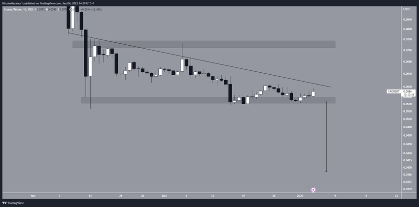 Günlük grafiğin teknik analizine göre CRO, 13 Kasım’dan bu yana alçalan direnç çizgisini takip ediyor. 0,056 dolar yatay destek bölgesi ile de bir araya geldiğinde bu, alçalan üçgen oluşturuyor. Alçalan üçgen ise ayı formasyonudur.